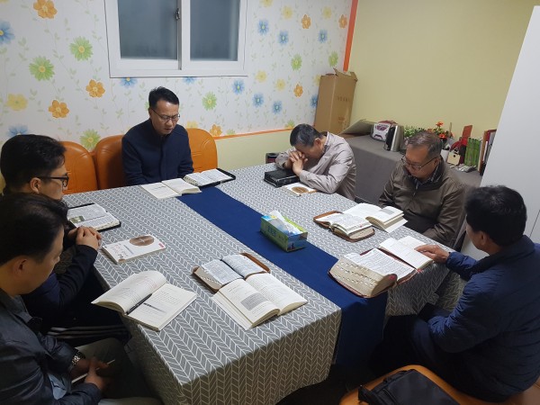 매주 주일새벽예배후 구역공과교육받는 남전도회장님들(인도:남기진 장로님)